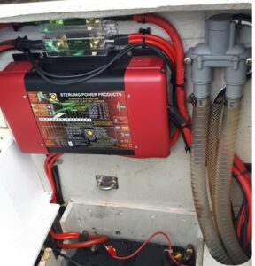 Un  chargeur d’alternateur stearling de 130 A  a été branché en lieu et place du répartiteur de charge. Au démarrage le comportement du chargeur d’alternateur se comporte comme un répartiteur avec un contrôle spécifique du comportement de la batterie moteur. Quand celle ci à repris sa charge initiale (après une ou deux minutes sur une installation en état), le chargeur d’alternateur maintient la batterie moteur en tension et « trompe » l’alternateur en simulant une batterie déchargée pour que celui ci fournisse un maximum de courant qui est ensuite amplifié en tension pour recharger les batteries de service avec un cycle de charge adapté.